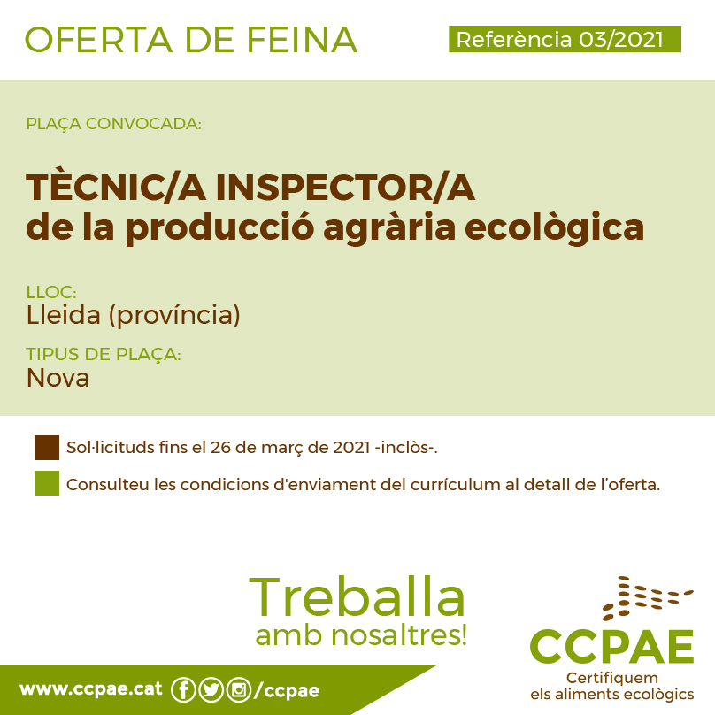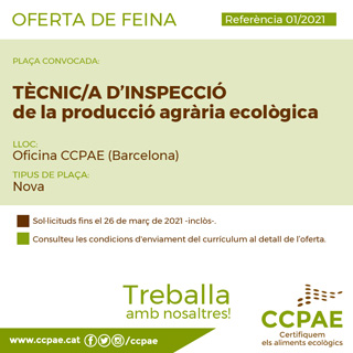 El CCPAE convoca quatre places noves de perfil tècnic. Dues corresponen a tècnic/a d'oficina, una d'inspecció i una altra de certificació. Les altres dues corresponen a tècnic/a inspector/a per a les quals és indispensable residir a les comarques indicades a cada plaça convocada. El termini de presentació de currículums per a les quatre places finalitza divendres 26 de març de 2021, aquest inclòs.