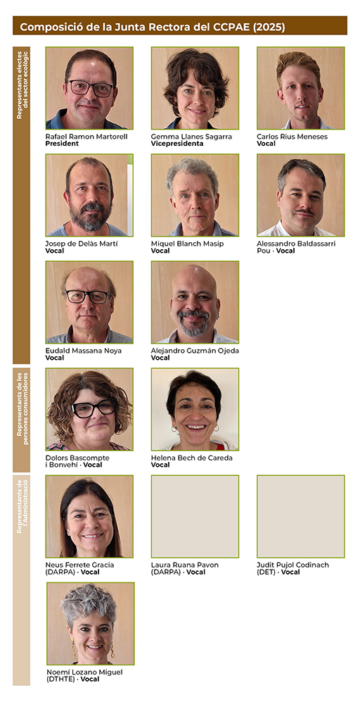 Actualment, i atenent les darreres eleccions celebrades el 27 de maig de 2025, la Junta Rectora del CCPAE està composada actualment per les persones representants següents: Representants electes de la secció d'operadors/es de producció, amb veu i vot: - Rafael Ramon Martorell - President - Pomona Fruits, SL (representant: Gemma Llanes Sagarra) - Vicepresidenta - Agrària i Ramadera del Pallars de Sort, SCCL (representant: Carlos Riu Meneses) - Vocal - Llavora Agropecuària, SL (representant: Josep de Delàs Martí) - Vocal