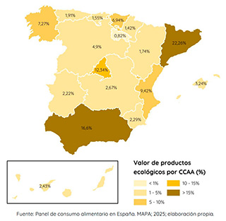 La despesa dels consumidors espanyols en productes ecològics va assolir el 2024 els 2.890 milions d'euros, un lleuger descens del 0,89% respecte al 2023. La despesa per càpita es va situar en 59,44 euros, amb un 94,2% del consum realitzat a la llar. Els productes ecològics van representar el 3,2% de la despesa total en alimentació.